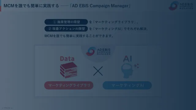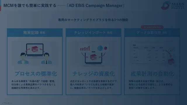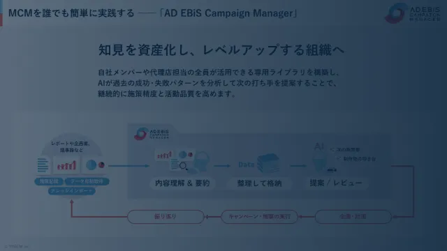 MCMはマーケティング活動をナレッジとして蓄積・再利用し、マーケティング組織の能力を向上させます。AD EBiS Campaign ManagerはMCMプロセスを組織に定着させる仕組みを提供します。